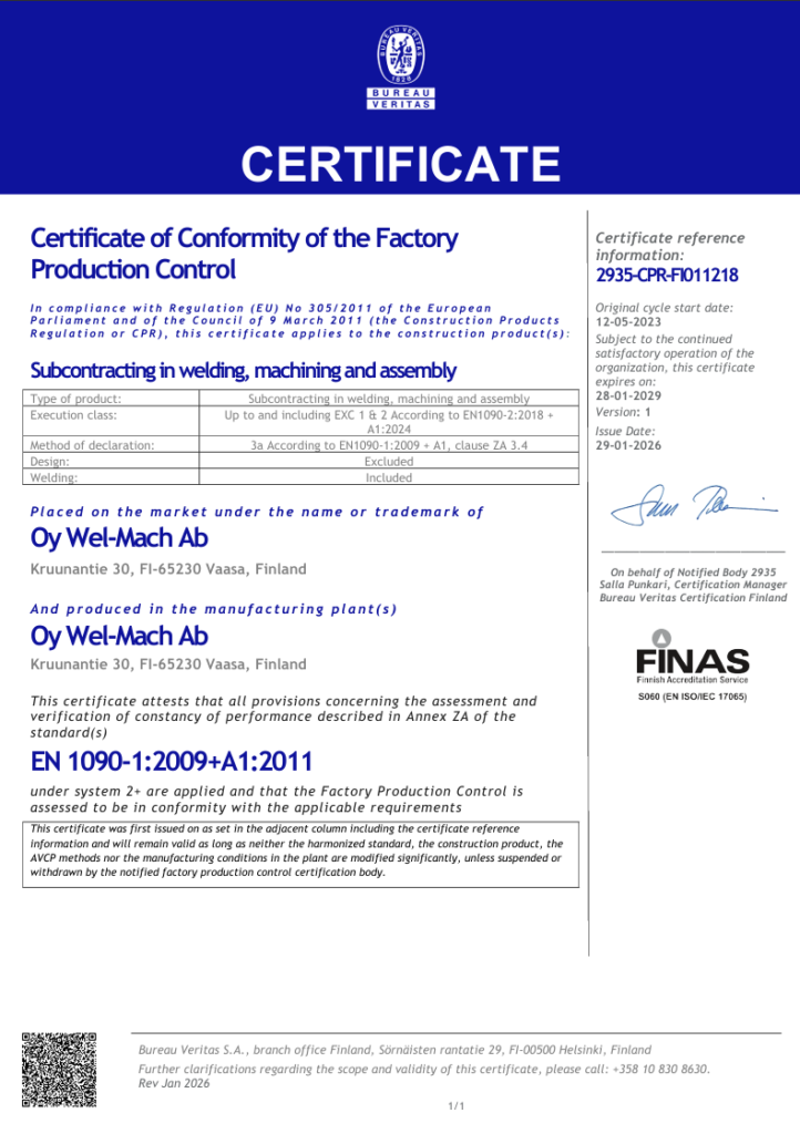 Meillä on nyt oikeus valmistaa EN 1090 -standardin mukaisesti CE-merkittyjä kantavia teräsrakenteita toteutusluokkaan EXC2 saakka.