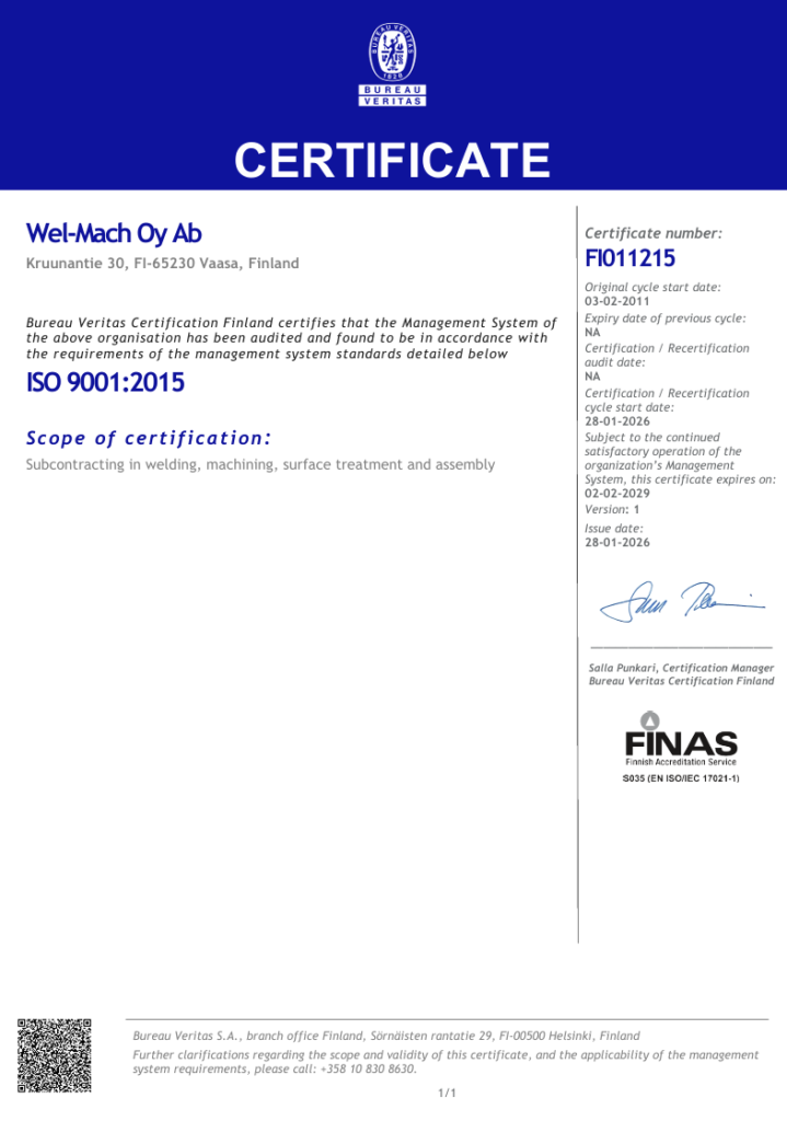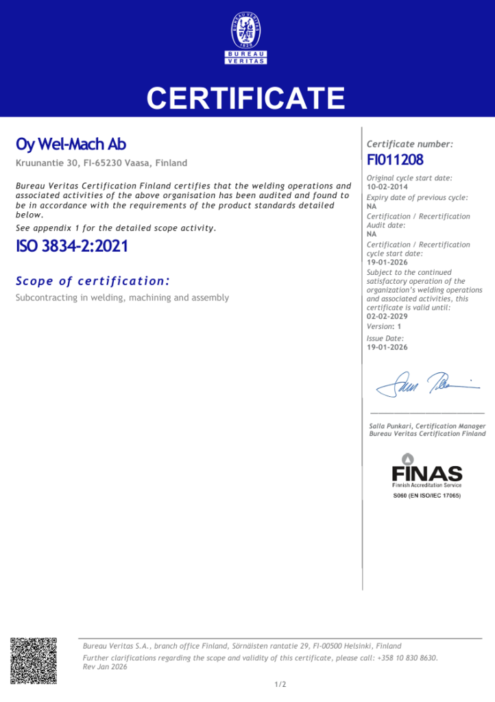 Toimintamme on SFS-EN ISO 9001:2015- ja SFS-EN ISO 14001:2015 -standardien mukaan sertifioitua. Hitsausosastomme on sertifioitu EN 3834-2 -standardin mukaan.